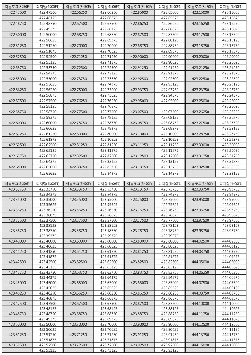 목록 [기타] 400M 간이주파수 차트 작성자 잘텍 작성일 17-05-01 14:23 | 조회 61,390 | 댓글 0 본문 아날로그 / 디지털 이전글다음글 댓글목록 0 등록된 댓글이 없습니다. 목록